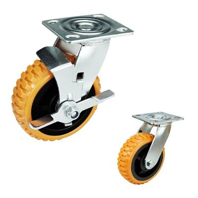 6 inch heavy duty pp core orange pvc top plate swivel caster wheels with side brake. They are soft wheel can protect floor. Logo on bracket or on packing carton is available. Dust covers are aslo customizable. And they can protect the ball bearing from sands and wire.